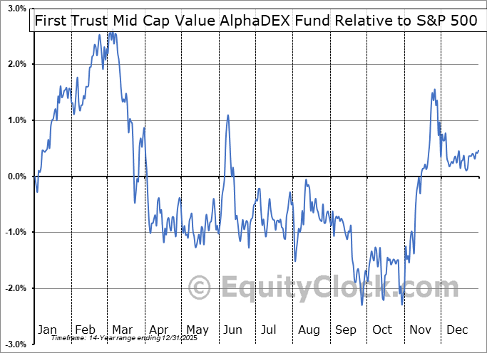 Analysis of the First Trust Mid Cap Value AlphaDEX Fund (NASD:FNK) seasonal charts above shows that a Buy Date of August 23 and a Sell Date of January 7 has resulted in a geometric average return of 2.21% above the benchmark rate of the S&P 500 Total Return Index over the past 13 years. This seasonal timeframe has shown positive results compared to the benchmark in 10 of those periods. This is a good rate of success and the return strongly outperforms the relative buy-and-hold performance of the stock over the past 13 years by an average of 6.22% per year.