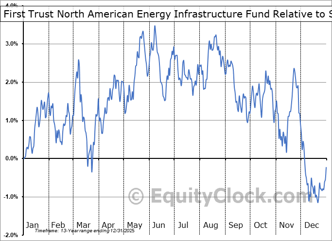 Analysis of the First Trust North American Energy Infrastructure Fund (AMEX:EMLP) seasonal charts above shows that a Buy Date of March 16 and a Sell Date of June 5 has resulted in a geometric average return of 1.87% above the benchmark rate of the S&P 500 Total Return Index over the past 12 years. This seasonal timeframe has shown positive results compared to the benchmark in 9 of those periods. This is a good rate of success and the return strongly outperforms the relative buy-and-hold performance of the stock over the past 12 years by an average of 7.04% per year.