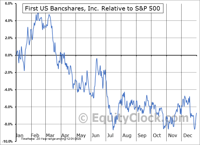 Analysis of the First US Bancshares, Inc. (NASD:FUSB) seasonal charts above shows that a Buy Date of November 3 and a Sell Date of January 31 has resulted in a geometric average return of 2.77% above the benchmark rate of the S&P 500 Total Return Index over the past 20 years. This seasonal timeframe has shown positive results compared to the benchmark in 15 of those periods. This is a good rate of success and the return strongly outperforms the relative buy-and-hold performance of the stock over the past 20 years by an average of 14.54% per year.