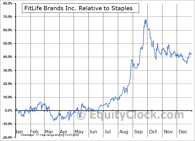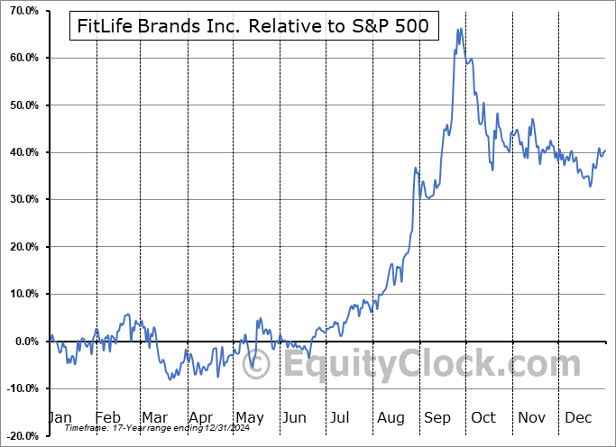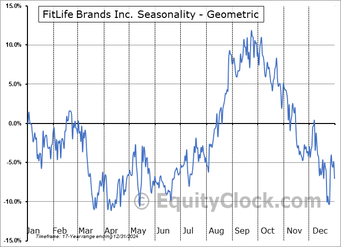 Analysis of the FitLife Brands Inc. (NASD:FTLF) seasonal charts above shows that a Buy Date of June 15 and a Sell Date of October 3 has resulted in a geometric average return of 19.33% above the benchmark rate of the S&P 500 Total Return Index over the past 17 years. This seasonal timeframe has shown positive results compared to the benchmark in 14 of those periods. This is a very good rate of success and the return strongly outperforms the relative buy-and-hold performance of the stock over the past 17 years by an average of 35.43% per year.