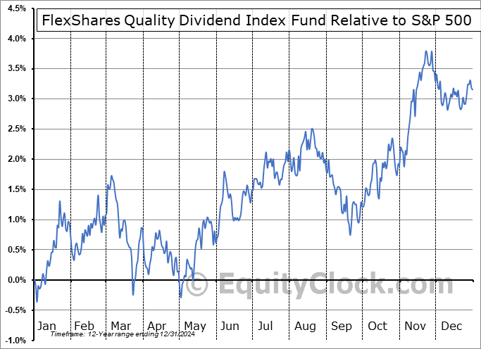Analysis of the FlexShares Quality Dividend Index Fund (AMEX:QDF) seasonal charts above shows that a Buy Date of September 9 and a Sell Date of January 22 has resulted in a geometric average return of 0.31% above the benchmark rate of the S&P 500 Total Return Index over the past 11 years. This seasonal timeframe has shown positive results compared to the benchmark in 8 of those periods. This is a good rate of success and the return strongly outperforms the relative buy-and-hold performance of the stock over the past 11 years by an average of 2.79% per year.