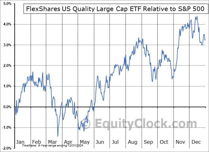 Analysis of the FlexShares US Quality Large Cap ETF (NASD:QLC) seasonal charts above shows that a Buy Date of September 20 and a Sell Date of January 28 has resulted in a geometric average return of 0.05% above the benchmark rate of the S&P 500 Total Return Index over the past 9 years. This seasonal timeframe has shown positive results compared to the benchmark in 6 of those periods. This is a good rate of success and the return strongly outperforms the relative buy-and-hold performance of the stock over the past 9 years by an average of 2.26% per year.