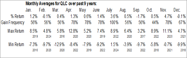 A word of caution: Only 9 years of data is available for shares of QLC, perhaps insufficient to create a seasonal profile that accurately gauges the seasonal tendencies influencing the investment. Ideally, while 20 years is preferred, at least 10 years of data is required to perform a seasonal analysis that is considered to be reliable for future seasonal periods.