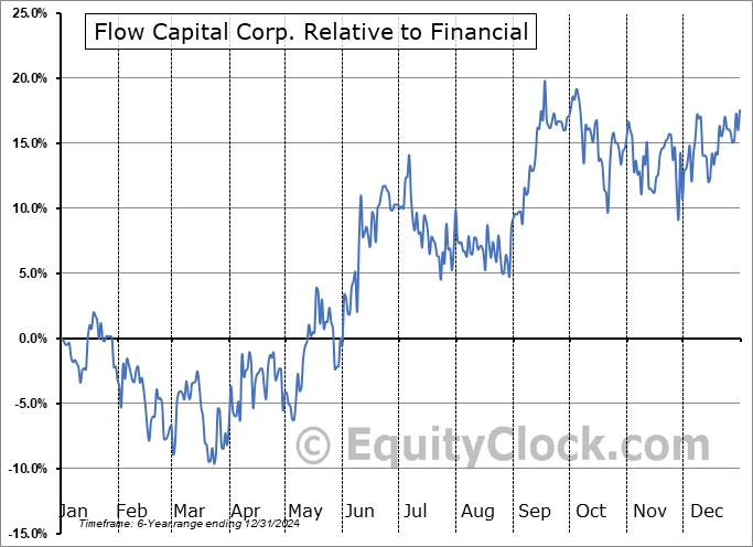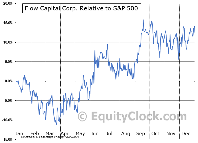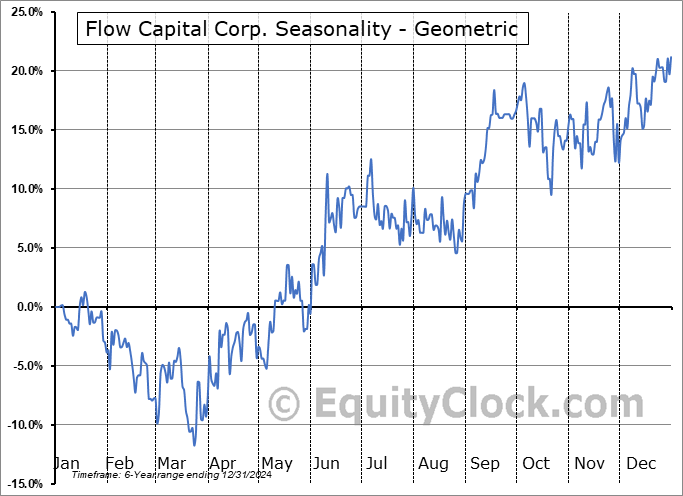 Analysis of the Flow Capital Corp. (TSXV:FW.V) seasonal charts above shows that a Buy Date of February 17 and a Sell Date of June 11 has resulted in a geometric average return of 14.86% above the benchmark rate of the S&P 500 Total Return Index over the past 6 years. This seasonal timeframe has shown positive results compared to the benchmark in 6 of those periods. This is an excellent rate of success and the return strongly outperforms the relative buy-and-hold performance of the stock over the past 6 years by an average of 11.77% per year.