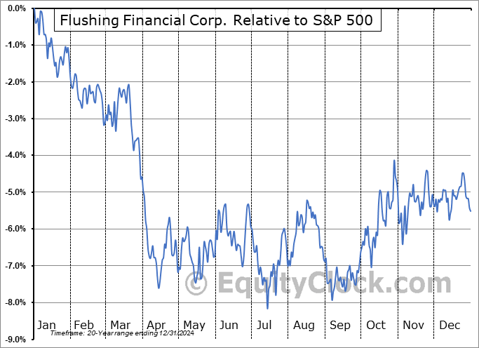 Analysis of the Flushing Financial Corp. (NASD:FFIC) seasonal charts above shows that a Buy Date of August 2 and a Sell Date of October 24 has resulted in a geometric average return of 1.37% above the benchmark rate of the S&P 500 Total Return Index over the past 20 years. This seasonal timeframe has shown positive results compared to the benchmark in 15 of those periods. This is a good rate of success and the return strongly outperforms the relative buy-and-hold performance of the stock over the past 20 years by an average of 8.74% per year.
