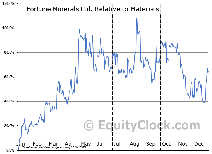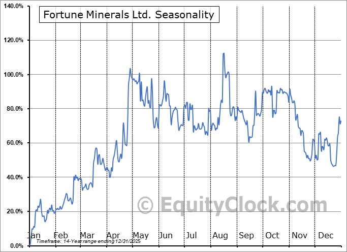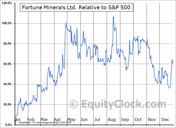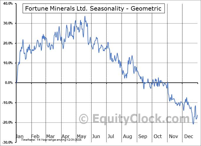 Analysis of the Fortune Minerals Ltd. (OTCMKT:FTMDF) seasonal charts above shows that a Buy Date of November 30 and a Sell Date of February 24 has resulted in a geometric average return of 15.43% above the benchmark rate of the S&P 500 Total Return Index over the past 13 years. This seasonal timeframe has shown positive results compared to the benchmark in 11 of those periods. This is a very good rate of success and the return strongly outperforms the relative buy-and-hold performance of the stock over the past 13 years by an average of 46.26% per year.