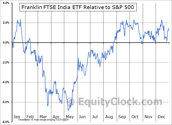Analysis of the Franklin FTSE India ETF (AMEX:FLIN) seasonal charts above shows that a Buy Date of August 22 and a Sell Date of January 13 has resulted in a geometric average return of 4.47% above the benchmark rate of the S&P 500 Total Return Index over the past 6 years. This seasonal timeframe has shown positive results compared to the benchmark in 6 of those periods. This is an excellent rate of success and the return strongly outperforms the relative buy-and-hold performance of the stock over the past 6 years by an average of 9.87% per year.