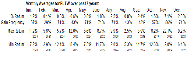 A word of caution: Only 6 years of data is available for shares of FLTW, perhaps insufficient to create a seasonal profile that accurately gauges the seasonal tendencies influencing the investment. Ideally, while 20 years is preferred, at least 10 years of data is required to perform a seasonal analysis that is considered to be reliable for future seasonal periods.