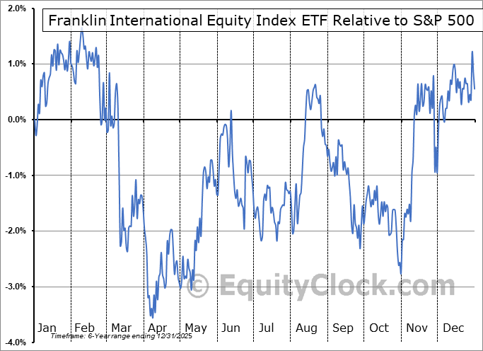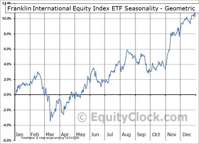 Analysis of the Franklin International Equity Index ETF (NEO:FLUR.NE) seasonal charts above shows that a Buy Date of October 30 and a Sell Date of January 27 has resulted in a geometric average return of 1.67% above the benchmark rate of the S&P 500 Total Return Index over the past 6 years. This seasonal timeframe has shown positive results compared to the benchmark in 5 of those periods. This is a very good rate of success and the return strongly outperforms the relative buy-and-hold performance of the stock over the past 6 years by an average of 5.74% per year.