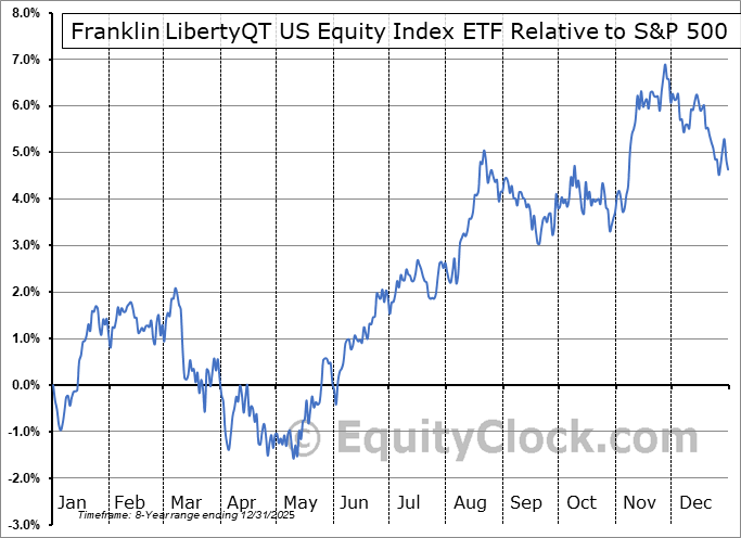 Analysis of the Franklin LibertyQT US Equity Index ETF (TSE:FLUS.TO) seasonal charts above shows that a Buy Date of January 7 and a Sell Date of March 28 has resulted in a geometric average return of 2.31% above the benchmark rate of the S&P 500 Total Return Index over the past 7 years. This seasonal timeframe has shown positive results compared to the benchmark in 6 of those periods. This is a very good rate of success and the return outperforms the relative buy-and-hold performance of the stock over the past 7 years by an average of 1.56% per year.