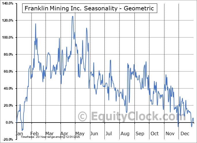 Analysis of the Franklin Mining Inc. (OTCMKT:FMNJ) seasonal charts above shows that a Buy Date of January 1 and a Sell Date of April 30 has resulted in a geometric average return of 124.09% above the benchmark rate of the S&P 500 Total Return Index over the past 20 years. This seasonal timeframe has shown positive results compared to the benchmark in 15 of those periods. This is a good rate of success and the return strongly outperforms the relative buy-and-hold performance of the stock over the past 20 years by an average of 141.66% per year.