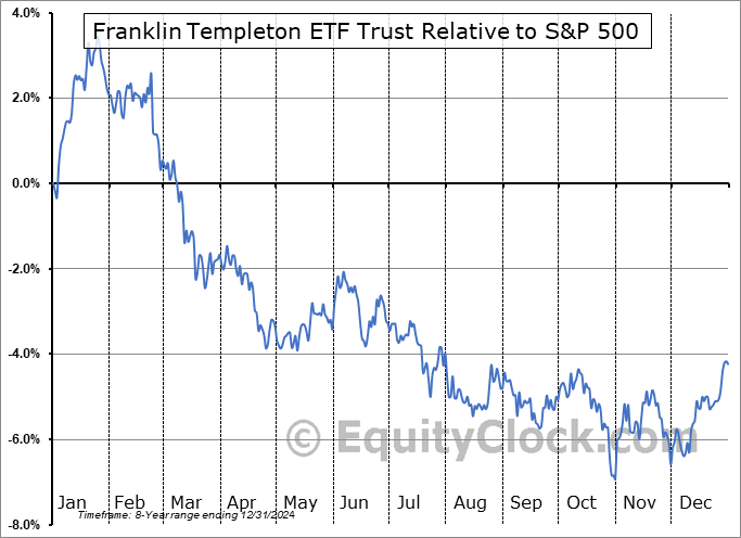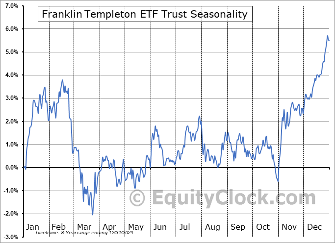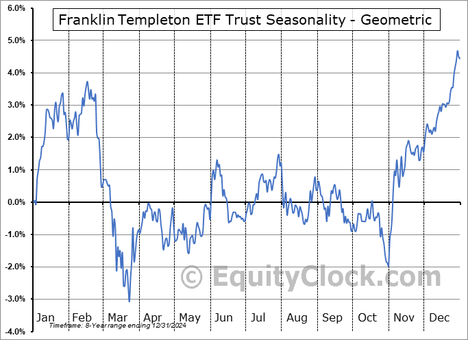 Analysis of the Franklin Templeton ETF Trust (AMEX:DIEM) seasonal charts above shows that a Buy Date of November 30 and a Sell Date of February 27 has resulted in a geometric average return of 1.94% above the benchmark rate of the S&P 500 Total Return Index over the past 8 years. This seasonal timeframe has shown positive results compared to the benchmark in 7 of those periods. This is a very good rate of success and the return strongly outperforms the relative buy-and-hold performance of the stock over the past 8 years by an average of 10.85% per year.