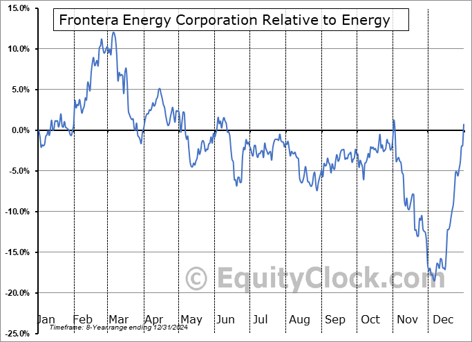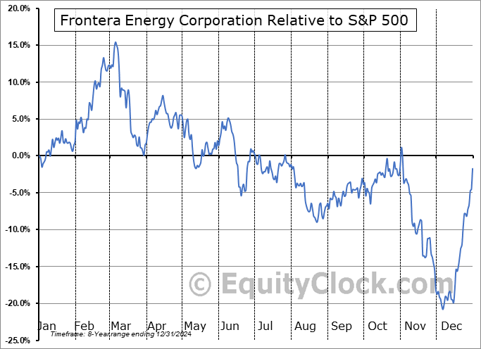 Analysis of the Frontera Energy Corporation (TSE:FEC.TO) seasonal charts above shows that a Buy Date of December 15 and a Sell Date of March 4 has resulted in a geometric average return of 19.97% above the benchmark rate of the S&P 500 Total Return Index over the past 8 years. This seasonal timeframe has shown positive results compared to the benchmark in 5 of those periods. This is a fair rate of success and the return strongly outperforms the relative buy-and-hold performance of the stock over the past 8 years by an average of 43.03% per year.