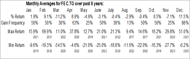 A word of caution: Only 8 years of data is available for shares of FEC.TO, perhaps insufficient to create a seasonal profile that accurately gauges the seasonal tendencies influencing the investment. Ideally, while 20 years is preferred, at least 10 years of data is required to perform a seasonal analysis that is considered to be reliable for future seasonal periods.