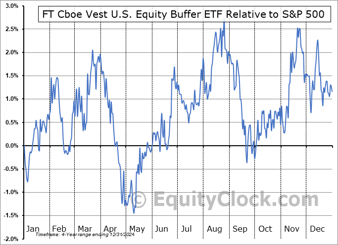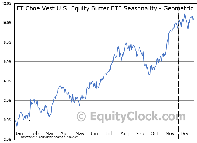 Analysis of the FT Cboe Vest U.S. Equity Buffer ETF (AMEX:FJUL) seasonal charts above shows that a Buy Date of July 10 and a Sell Date of September 30 has resulted in a geometric average return of 2.04% above the benchmark rate of the S&P 500 Total Return Index over the past 4 years. This seasonal timeframe has shown positive results compared to the benchmark in 4 of those periods. This is an excellent rate of success and the return strongly outperforms the relative buy-and-hold performance of the stock over the past 4 years by an average of 4.82% per year.