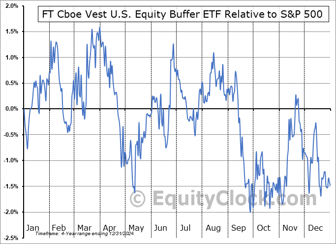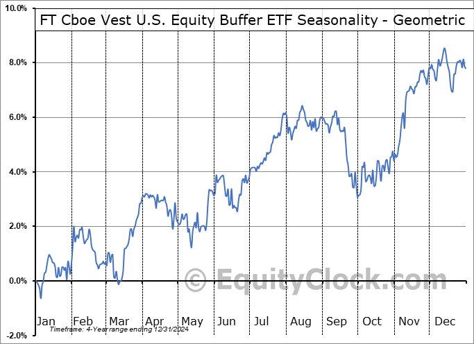 Analysis of the FT Cboe Vest U.S. Equity Buffer ETF (AMEX:FOCT) seasonal charts above shows that a Buy Date of July 10 and a Sell Date of September 30 has resulted in a geometric average return of 1.09% above the benchmark rate of the S&P 500 Total Return Index over the past 4 years. This seasonal timeframe has shown positive results compared to the benchmark in 3 of those periods. This is a good rate of success and the return strongly outperforms the relative buy-and-hold performance of the stock over the past 4 years by an average of 6.12% per year.