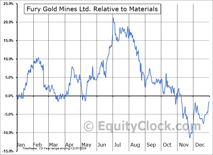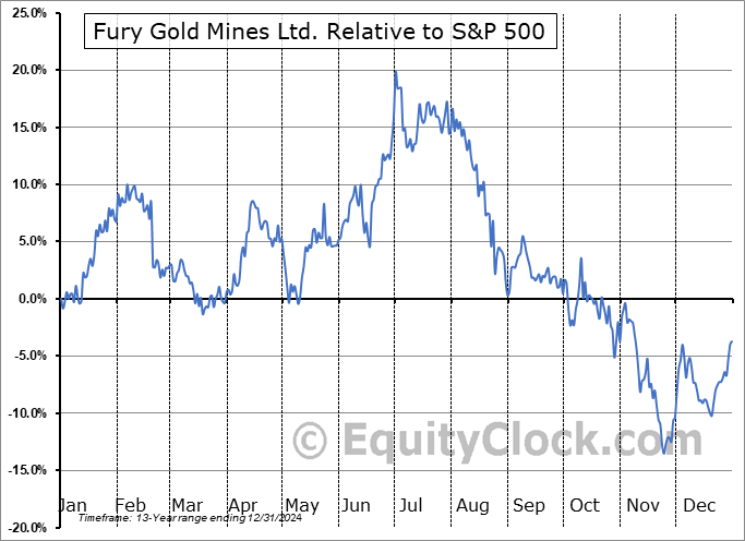 Analysis of the Fury Gold Mines Ltd. (AMEX:FURY) seasonal charts above shows that a Buy Date of October 31 and a Sell Date of February 3 has resulted in a geometric average return of 5.45% above the benchmark rate of the S&P 500 Total Return Index over the past 13 years. This seasonal timeframe has shown positive results compared to the benchmark in 9 of those periods. This is a good rate of success and the return strongly outperforms the relative buy-and-hold performance of the stock over the past 13 years by an average of 25.13% per year.