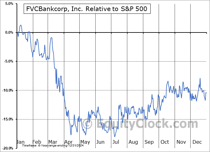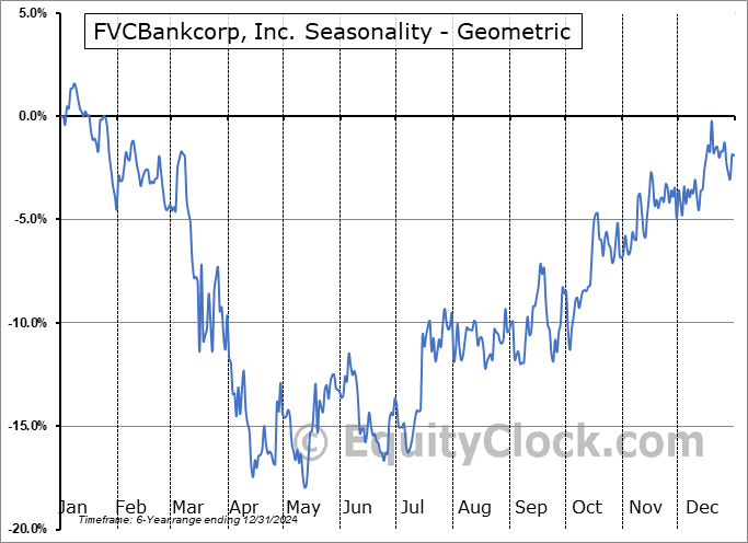 Analysis of the FVCBankcorp, Inc. (NASD:FVCB) seasonal charts above shows that a Buy Date of July 22 and a Sell Date of October 18 has resulted in a geometric average return of 7.24% above the benchmark rate of the S&P 500 Total Return Index over the past 6 years. This seasonal timeframe has shown positive results compared to the benchmark in 6 of those periods. This is an excellent rate of success and the return strongly outperforms the relative buy-and-hold performance of the stock over the past 6 years by an average of 23.84% per year.