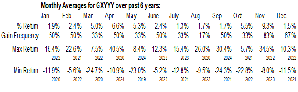 A word of caution: Only 6 years of data is available for shares of GXYYY, perhaps insufficient to create a seasonal profile that accurately gauges the seasonal tendencies influencing the investment. Ideally, while 20 years is preferred, at least 10 years of data is required to perform a seasonal analysis that is considered to be reliable for future seasonal periods.