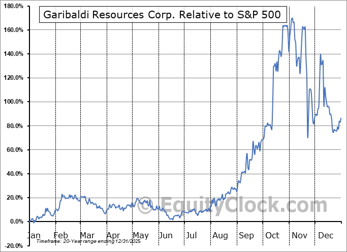 Analysis of the Garibaldi Resources Corp. (TSXV:GGI.V) seasonal charts above shows that a Buy Date of December 28 and a Sell Date of April 24 has resulted in a geometric average return of 6.38% above the benchmark rate of the S&P 500 Total Return Index over the past 20 years. This seasonal timeframe has shown positive results compared to the benchmark in 12 of those periods. This is a fair rate of success and the return strongly outperforms the relative buy-and-hold performance of the stock over the past 20 years by an average of 19.4% per year.
