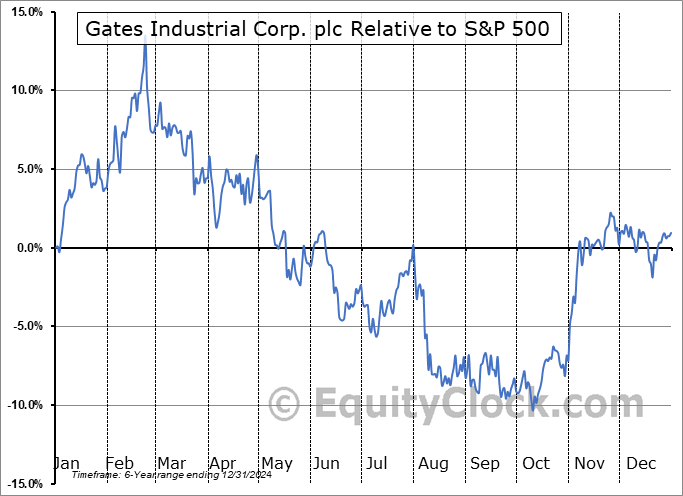 Analysis of the Gates Industrial Corp. plc (NYSE:GTES) seasonal charts above shows that a Buy Date of October 30 and a Sell Date of February 27 has resulted in a geometric average return of 9.45% above the benchmark rate of the S&P 500 Total Return Index over the past 6 years. This seasonal timeframe has shown positive results compared to the benchmark in 6 of those periods. This is an excellent rate of success and the return strongly outperforms the relative buy-and-hold performance of the stock over the past 6 years by an average of 17.67% per year.