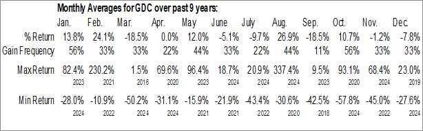 A word of caution: Only 8 years of data is available for shares of GDC, perhaps insufficient to create a seasonal profile that accurately gauges the seasonal tendencies influencing the investment. Ideally, while 20 years is preferred, at least 10 years of data is required to perform a seasonal analysis that is considered to be reliable for future seasonal periods.