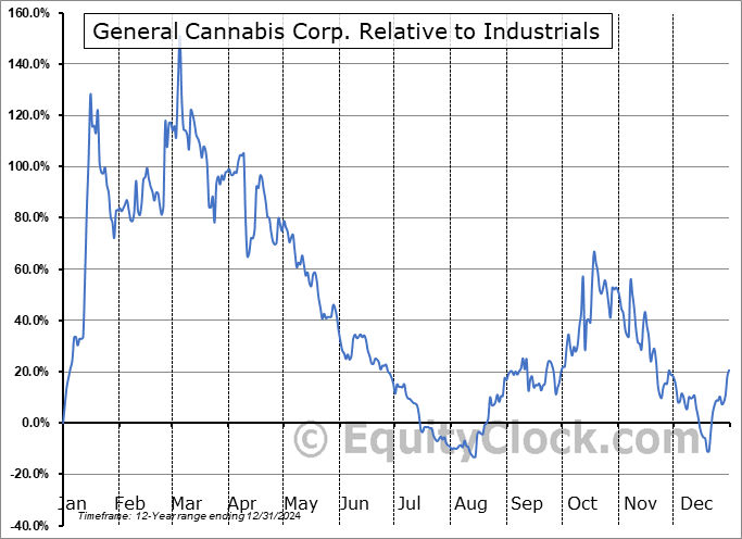 Analysis of the General Cannabis Corp. (OTCMKT:CANN) seasonal charts above shows that a Buy Date of December 28 and a Sell Date of March 31 has resulted in a geometric average return of 42.79% above the benchmark rate of the S&P 500 Total Return Index over the past 12 years. This seasonal timeframe has shown positive results compared to the benchmark in 10 of those periods. This is a very good rate of success and the return strongly outperforms the relative buy-and-hold performance of the stock over the past 12 years by an average of 80.22% per year.