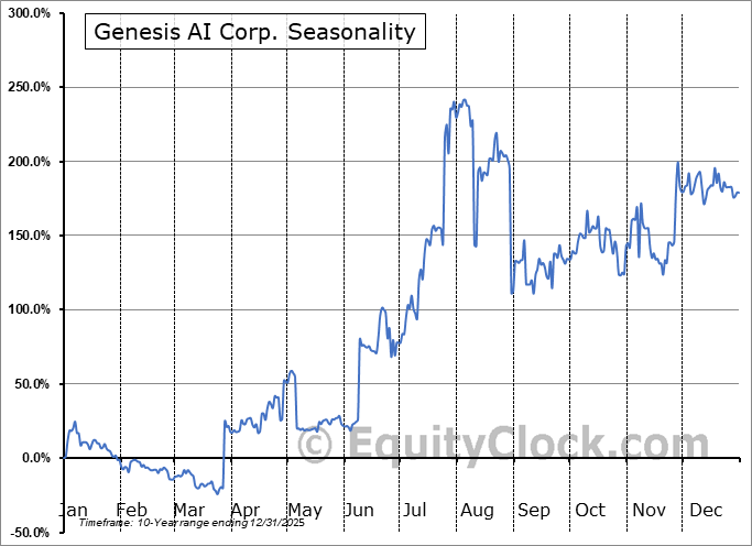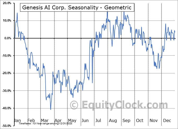 Analysis of the Genesis AI Corp. (CSE:AIG.CA) seasonal charts above shows that a Buy Date of June 4 and a Sell Date of September 6 has resulted in a geometric average return of 57.32% above the benchmark rate of the S&P 500 Total Return Index over the past 10 years. This seasonal timeframe has shown positive results compared to the benchmark in 9 of those periods. This is an excellent rate of success and the return strongly outperforms the relative buy-and-hold performance of the stock over the past 10 years by an average of 67.29% per year.
