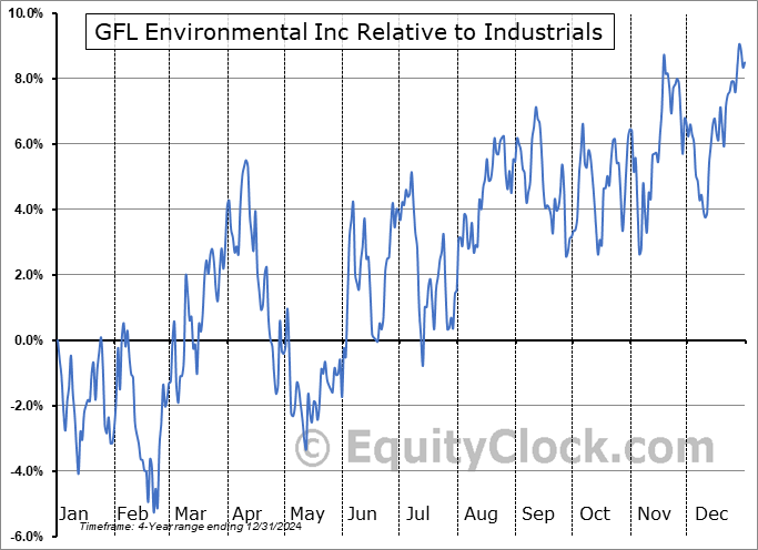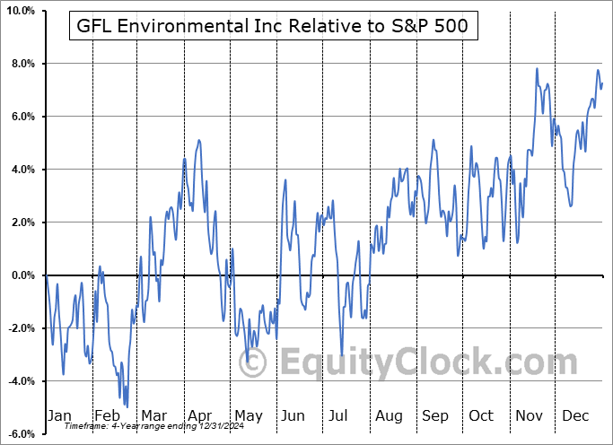 Analysis of the GFL Environmental Inc (TSE:GFL.TO) seasonal charts above shows that a Buy Date of January 29 and a Sell Date of April 21 has resulted in a geometric average return of 4.35% above the benchmark rate of the S&P 500 Total Return Index over the past 4 years. This seasonal timeframe has shown positive results compared to the benchmark in 4 of those periods. This is an excellent rate of success and the return strongly outperforms the relative buy-and-hold performance of the stock over the past 4 years by an average of 3.22% per year.