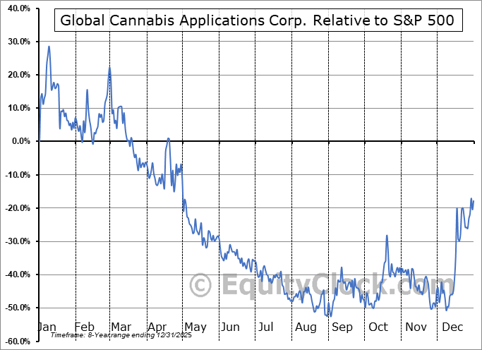 Analysis of the Global Cannabis Applications Corp. (CSE:APP.CA) seasonal charts above shows that a Buy Date of November 8 and a Sell Date of March 1 has resulted in a geometric average return of 40.1% above the benchmark rate of the S&P 500 Total Return Index over the past 8 years. This seasonal timeframe has shown positive results compared to the benchmark in 7 of those periods. This is a very good rate of success and the return strongly outperforms the relative buy-and-hold performance of the stock over the past 8 years by an average of 94.41% per year.