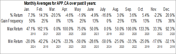 A word of caution: Only 8 years of data is available for shares of APP.CA, perhaps insufficient to create a seasonal profile that accurately gauges the seasonal tendencies influencing the investment. Ideally, while 20 years is preferred, at least 10 years of data is required to perform a seasonal analysis that is considered to be reliable for future seasonal periods.