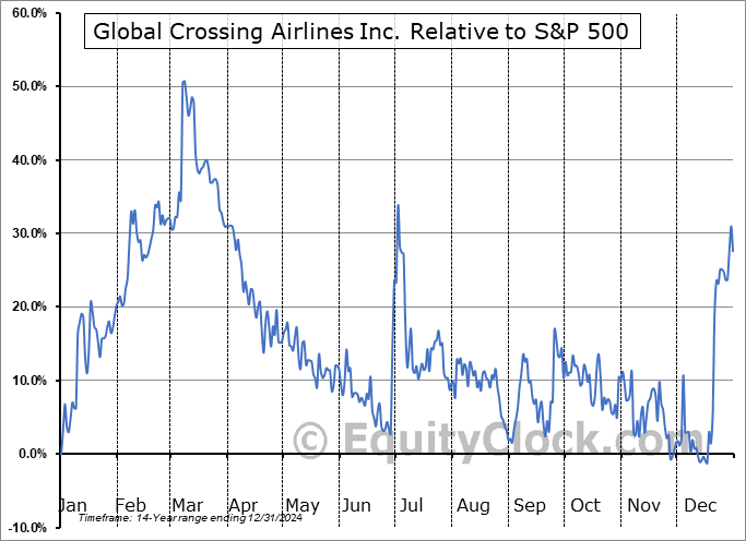 Analysis of the Global Crossing Airlines Inc. (NEO:JET.NE) seasonal charts above shows that a Buy Date of November 27 and a Sell Date of March 7 has resulted in a geometric average return of 48.72% above the benchmark rate of the S&P 500 Total Return Index over the past 14 years. This seasonal timeframe has shown positive results compared to the benchmark in 10 of those periods. This is a good rate of success and the return strongly outperforms the relative buy-and-hold performance of the stock over the past 14 years by an average of 80.23% per year.