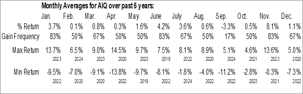 A word of caution: Only 6 years of data is available for shares of AIQ, perhaps insufficient to create a seasonal profile that accurately gauges the seasonal tendencies influencing the investment. Ideally, while 20 years is preferred, at least 10 years of data is required to perform a seasonal analysis that is considered to be reliable for future seasonal periods.