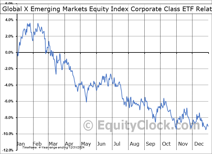 Analysis of the Global X Emerging Markets Equity Index Corporate Class ETF (TSE:HXEM.TO) seasonal charts above shows that a Buy Date of October 31 and a Sell Date of January 25 has resulted in a geometric average return of 2.9% above the benchmark rate of the S&P 500 Total Return Index over the past 4 years. This seasonal timeframe has shown positive results compared to the benchmark in 3 of those periods. This is a good rate of success and the return strongly outperforms the relative buy-and-hold performance of the stock over the past 4 years by an average of 14.81% per year.