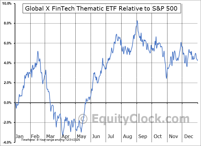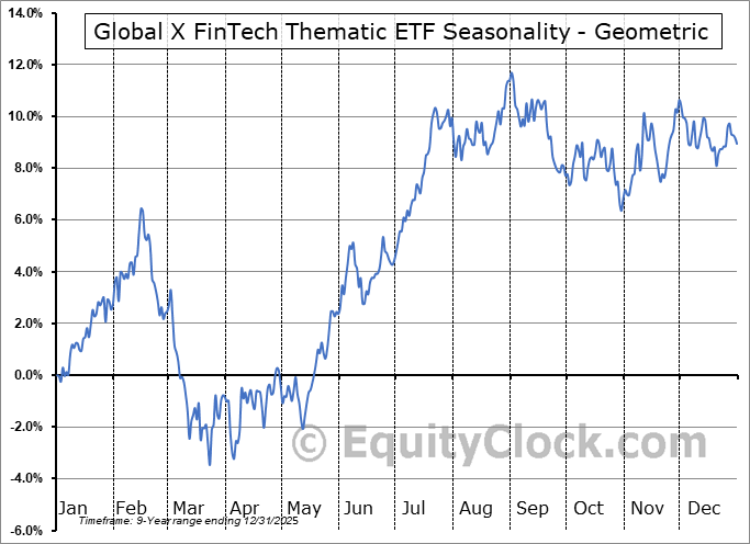 Analysis of the Global X FinTech Thematic ETF (NASD:FINX) seasonal charts above shows that a Buy Date of May 12 and a Sell Date of August 7 has resulted in a geometric average return of 4.73% above the benchmark rate of the S&P 500 Total Return Index over the past 8 years. This seasonal timeframe has shown positive results compared to the benchmark in 7 of those periods. This is a very good rate of success and the return strongly outperforms the relative buy-and-hold performance of the stock over the past 8 years by an average of 8.08% per year.