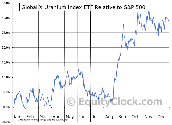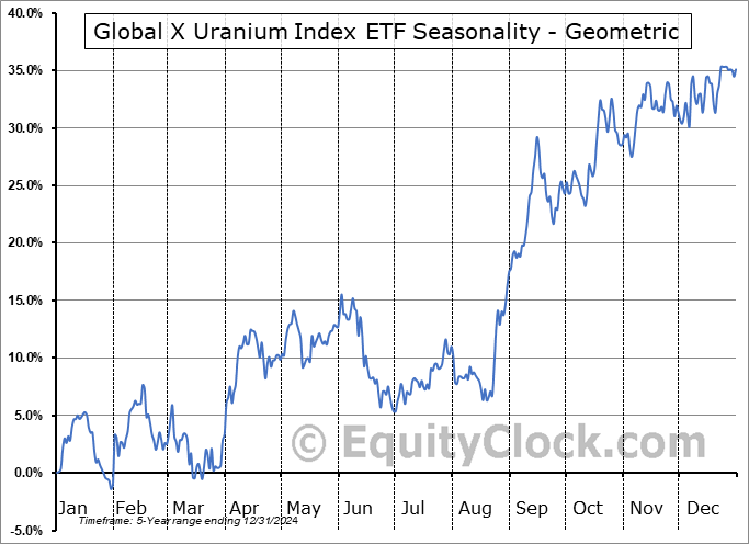 Analysis of the Global X Uranium Index ETF (TSE:HURA.TO) seasonal charts above shows that a Buy Date of August 17 and a Sell Date of December 23 has resulted in a geometric average return of 21.7% above the benchmark rate of the S&P 500 Total Return Index over the past 5 years. This seasonal timeframe has shown positive results compared to the benchmark in 5 of those periods. This is an excellent rate of success and the return strongly outperforms the relative buy-and-hold performance of the stock over the past 5 years by an average of 3.82% per year.