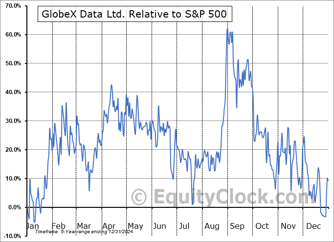 Analysis of the GlobeX Data Ltd. (CSE:SWIS.CA) seasonal charts above shows that a Buy Date of December 28 and a Sell Date of April 30 has resulted in a geometric average return of 34.58% above the benchmark rate of the S&P 500 Total Return Index over the past 5 years. This seasonal timeframe has shown positive results compared to the benchmark in 4 of those periods. This is a very good rate of success and the return strongly outperforms the relative buy-and-hold performance of the stock over the past 5 years by an average of 73.5% per year.