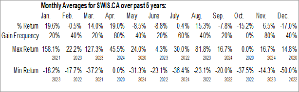 A word of caution: Only 5 years of data is available for shares of SWIS.CA, perhaps insufficient to create a seasonal profile that accurately gauges the seasonal tendencies influencing the investment. Ideally, while 20 years is preferred, at least 10 years of data is required to perform a seasonal analysis that is considered to be reliable for future seasonal periods.