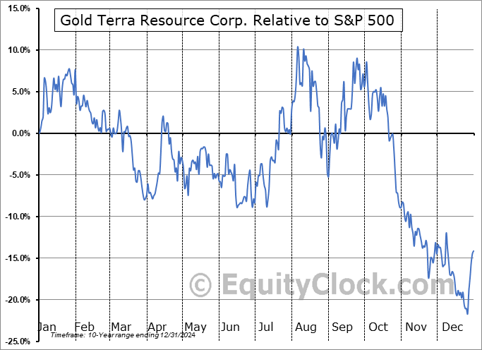 Analysis of the Gold Terra Resource Corp. (OTCMKT:YGTFF) seasonal charts above shows that a Buy Date of July 11 and a Sell Date of October 18 has resulted in a geometric average return of 7.9% above the benchmark rate of the S&P 500 Total Return Index over the past 10 years. This seasonal timeframe has shown positive results compared to the benchmark in 7 of those periods. This is a good rate of success and the return strongly outperforms the relative buy-and-hold performance of the stock over the past 10 years by an average of 32.86% per year.