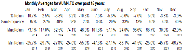 To download AUMN.TO seasonal chart data, please log in or Subscribe.