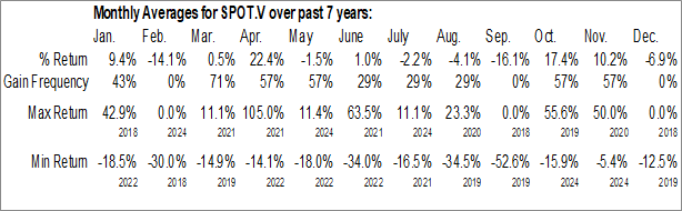 A word of caution: Only 7 years of data is available for shares of SPOT.V, perhaps insufficient to create a seasonal profile that accurately gauges the seasonal tendencies influencing the investment. Ideally, while 20 years is preferred, at least 10 years of data is required to perform a seasonal analysis that is considered to be reliable for future seasonal periods.