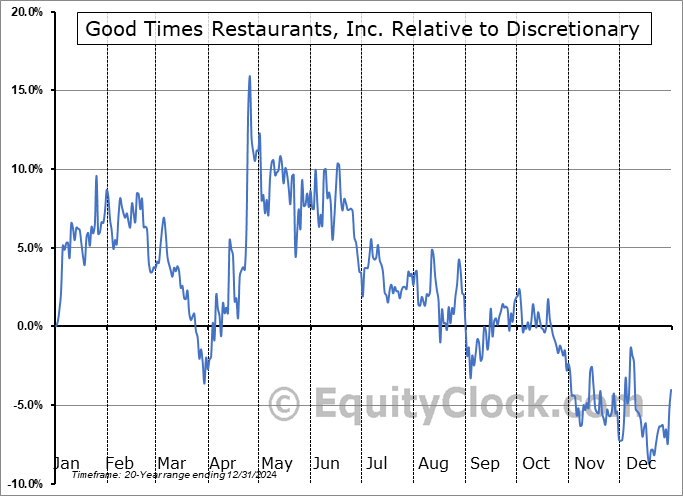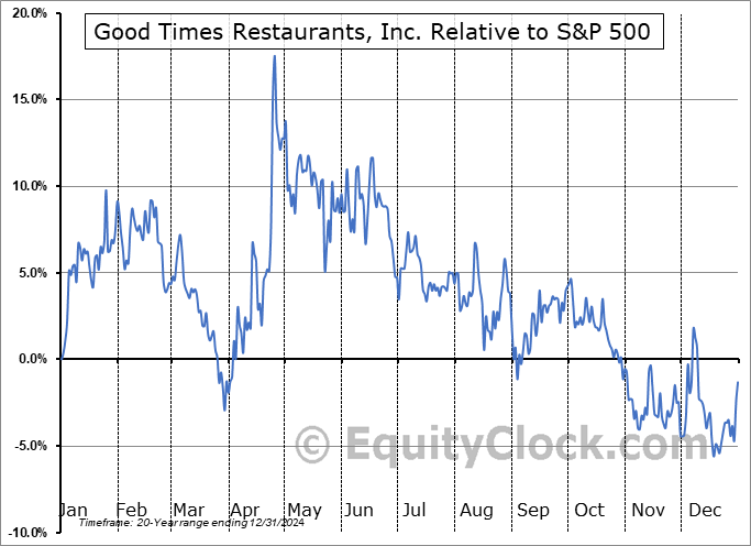 Analysis of the Good Times Restaurants, Inc. (NASD:GTIM) seasonal charts above shows that a Buy Date of March 29 and a Sell Date of June 23 has resulted in a geometric average return of 9.41% above the benchmark rate of the S&P 500 Total Return Index over the past 20 years. This seasonal timeframe has shown positive results compared to the benchmark in 14 of those periods. This is a good rate of success and the return strongly outperforms the relative buy-and-hold performance of the stock over the past 20 years by an average of 24.35% per year.