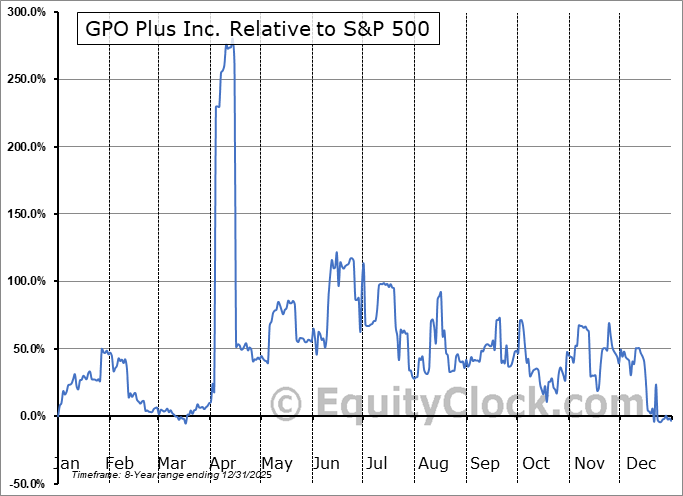 Analysis of the GPO Plus Inc. (OTCMKT:GPOX) seasonal charts above shows that a Buy Date of January 1 and a Sell Date of April 12 has resulted in a geometric average return of 82.31% above the benchmark rate of the S&P 500 Total Return Index over the past 8 years. This seasonal timeframe has shown positive results compared to the benchmark in 6 of those periods. This is a good rate of success and the return strongly outperforms the relative buy-and-hold performance of the stock over the past 8 years by an average of 118.5% per year.