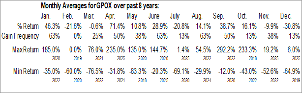 A word of caution: Only 8 years of data is available for shares of GPOX, perhaps insufficient to create a seasonal profile that accurately gauges the seasonal tendencies influencing the investment. Ideally, while 20 years is preferred, at least 10 years of data is required to perform a seasonal analysis that is considered to be reliable for future seasonal periods.