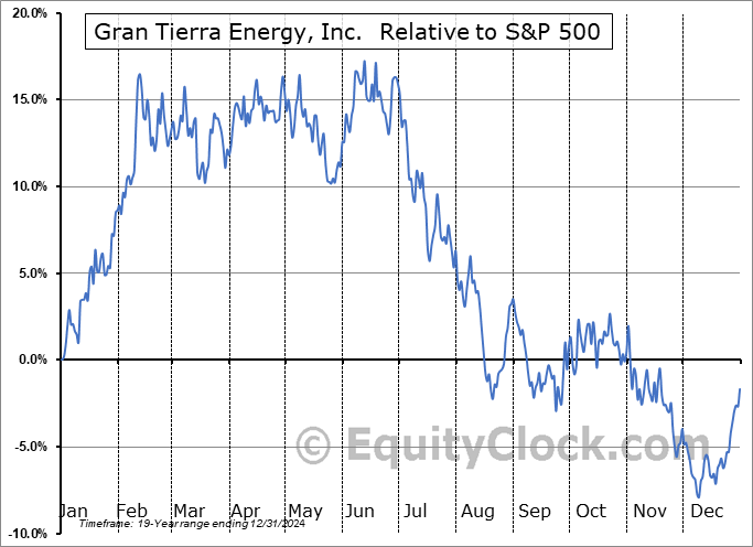 Analysis of the Gran Tierra Energy, Inc. (AMEX:GTE) seasonal charts above shows that a Buy Date of January 8 and a Sell Date of April 15 has resulted in a geometric average return of 4.69% above the benchmark rate of the S&P 500 Total Return Index over the past 19 years. This seasonal timeframe has shown positive results compared to the benchmark in 13 of those periods. This is a good rate of success and the return strongly outperforms the relative buy-and-hold performance of the stock over the past 19 years by an average of 21.34% per year.