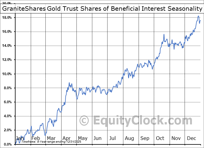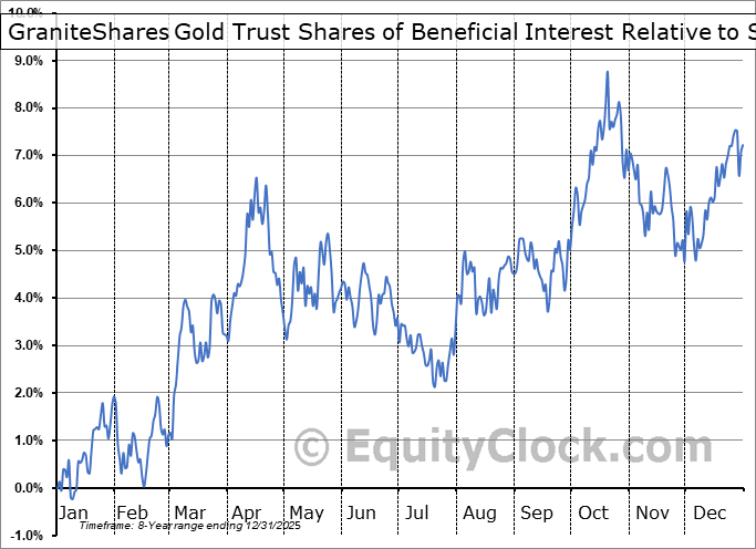 Analysis of the GraniteShares Gold Trust Shares of Beneficial Interest (AMEX:BAR) seasonal charts above shows that a Buy Date of November 30 and a Sell Date of April 9 has resulted in a geometric average return of 5.64% above the benchmark rate of the S&P 500 Total Return Index over the past 7 years. This seasonal timeframe has shown positive results compared to the benchmark in 6 of those periods. This is a very good rate of success and the return strongly outperforms the relative buy-and-hold performance of the stock over the past 7 years by an average of 8.52% per year.