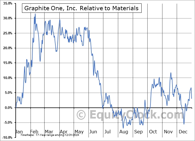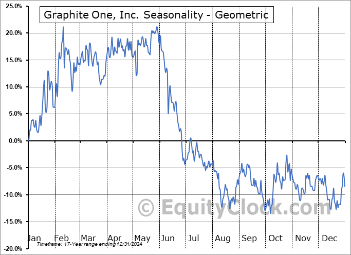 Analysis of the Graphite One, Inc. (TSXV:GPH.V) seasonal charts above shows that a Buy Date of December 20 and a Sell Date of May 15 has resulted in a geometric average return of 17.76% above the benchmark rate of the S&P 500 Total Return Index over the past 17 years. This seasonal timeframe has shown positive results compared to the benchmark in 12 of those periods. This is a good rate of success and the return strongly outperforms the relative buy-and-hold performance of the stock over the past 17 years by an average of 35.59% per year.