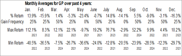 A word of caution: Only 4 years of data is available for shares of GP, perhaps insufficient to create a seasonal profile that accurately gauges the seasonal tendencies influencing the investment. Ideally, while 20 years is preferred, at least 10 years of data is required to perform a seasonal analysis that is considered to be reliable for future seasonal periods.