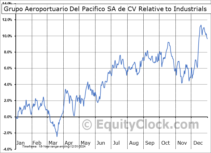 Analysis of the Grupo Aeroportuario Del Pacifico SA de CV (NYSE:PAC) seasonal charts above shows that a Buy Date of November 13 and a Sell Date of February 21 has resulted in a geometric average return of 6.38% above the benchmark rate of the S&P 500 Total Return Index over the past 18 years. This seasonal timeframe has shown positive results compared to the benchmark in 14 of those periods. This is a good rate of success and the return strongly outperforms the relative buy-and-hold performance of the stock over the past 18 years by an average of 2.75% per year.