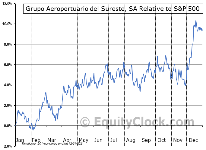 Analysis of the Grupo Aeroportuario del Sureste, SA (NYSE:ASR) seasonal charts above shows that a Buy Date of November 28 and a Sell Date of April 24 has resulted in a geometric average return of 7.22% above the benchmark rate of the S&P 500 Total Return Index over the past 20 years. This seasonal timeframe has shown positive results compared to the benchmark in 17 of those periods. This is a very good rate of success and the return strongly outperforms the relative buy-and-hold performance of the stock over the past 20 years by an average of 2.18% per year.
